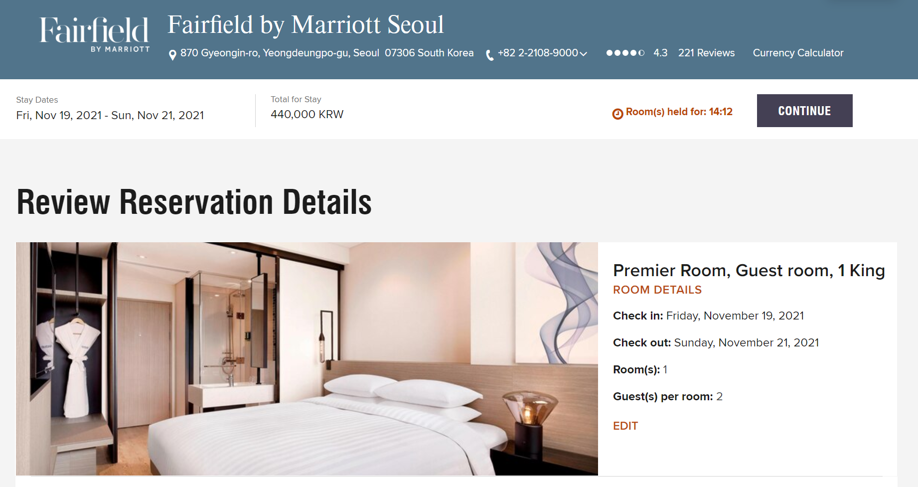 - our total stay cost 440,000 KRW, which is totaled to 484.00 CAD