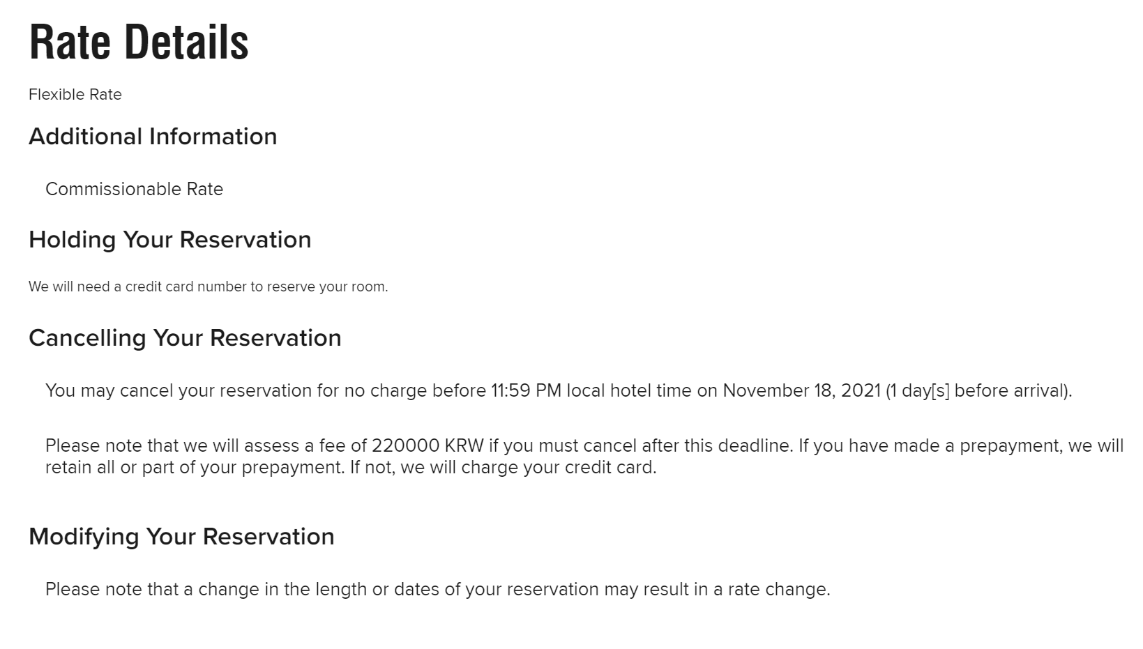 I have free cancellation until November 18, 2021. If failed to cancel my reservation pass the given date, the hotel will charge my credit card with 220,000 KRW, in CAD it is 242.00.