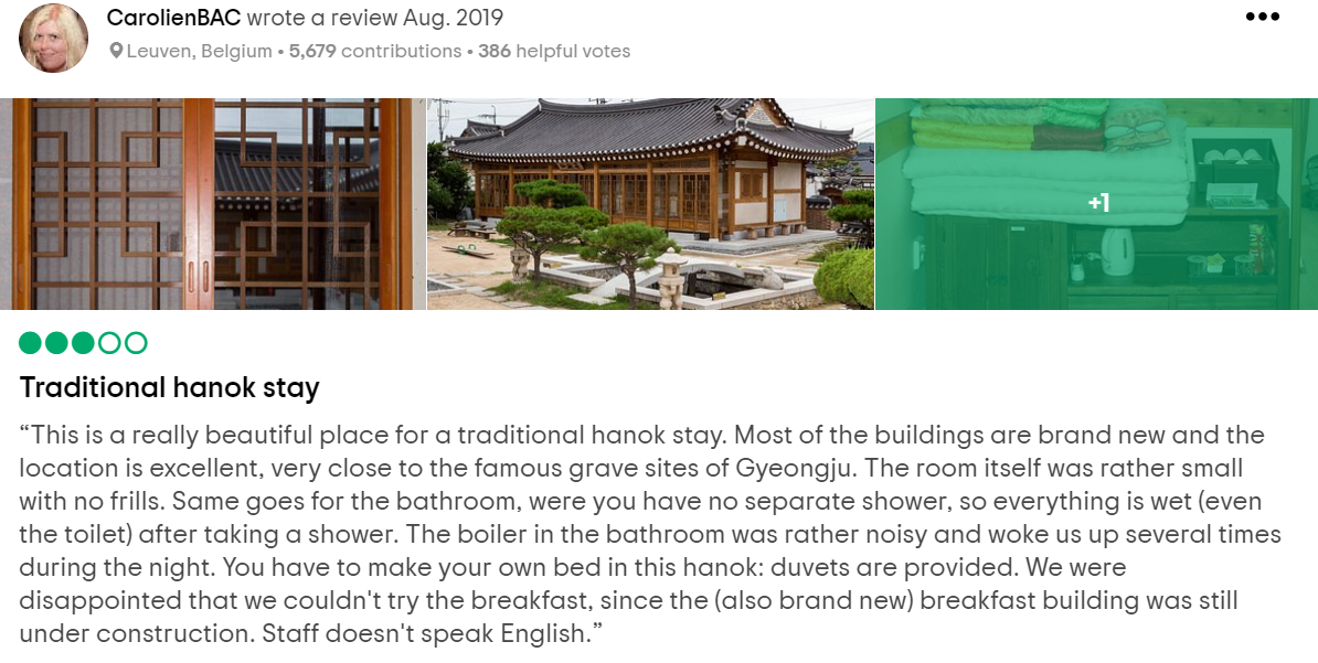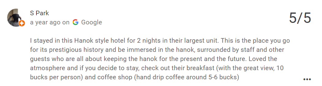 I chose a Hanok stay as one of my criteria, because Hanok is a traditional house in Korea, so I believe that travellers need to experience this accommodation type. They get to see the reality of conventional culture, maybe they could find out some history about the place, or even see nearby historical attractions. The travelers would get to know more about Korea's history, and being there at the same time would be a very wonderful experience to bring home.