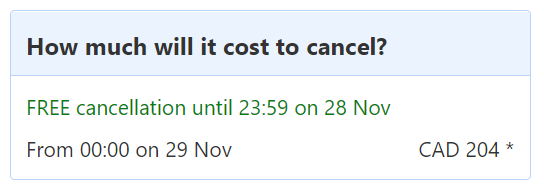 We have free cancellation until 28th of November. Past that date, I would get my credit card charged of 204.00 CAD.
